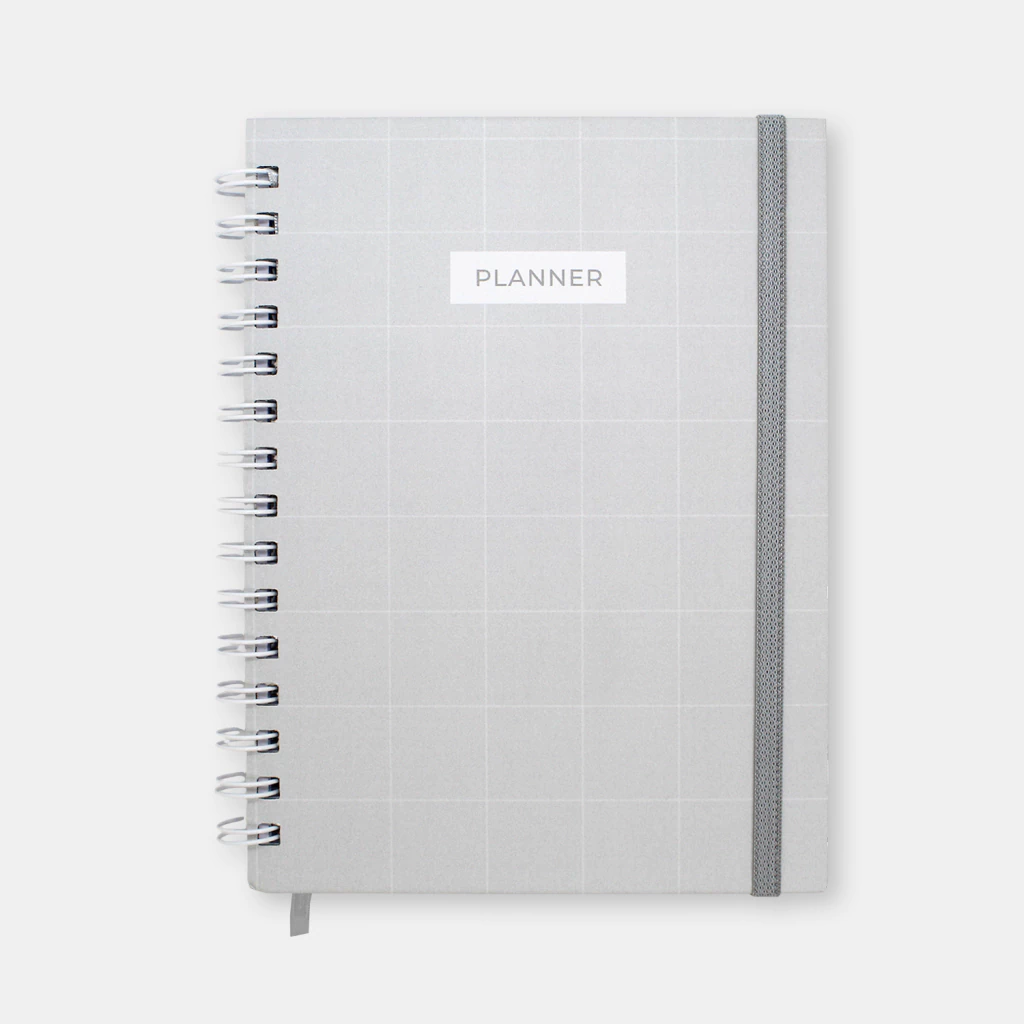 Planner semanal tamaño A5 con diseño elegante y minimalista. Tapa dura en tonos rosa pastel con grilla blanca, anillado doble ring color blanco, elástico de cierre y cinta señaladora. Interior con planificación horaria de Lunes a Domingo y espacio para objetivos y recordatorios. Ideal para organización personal o estudio.
